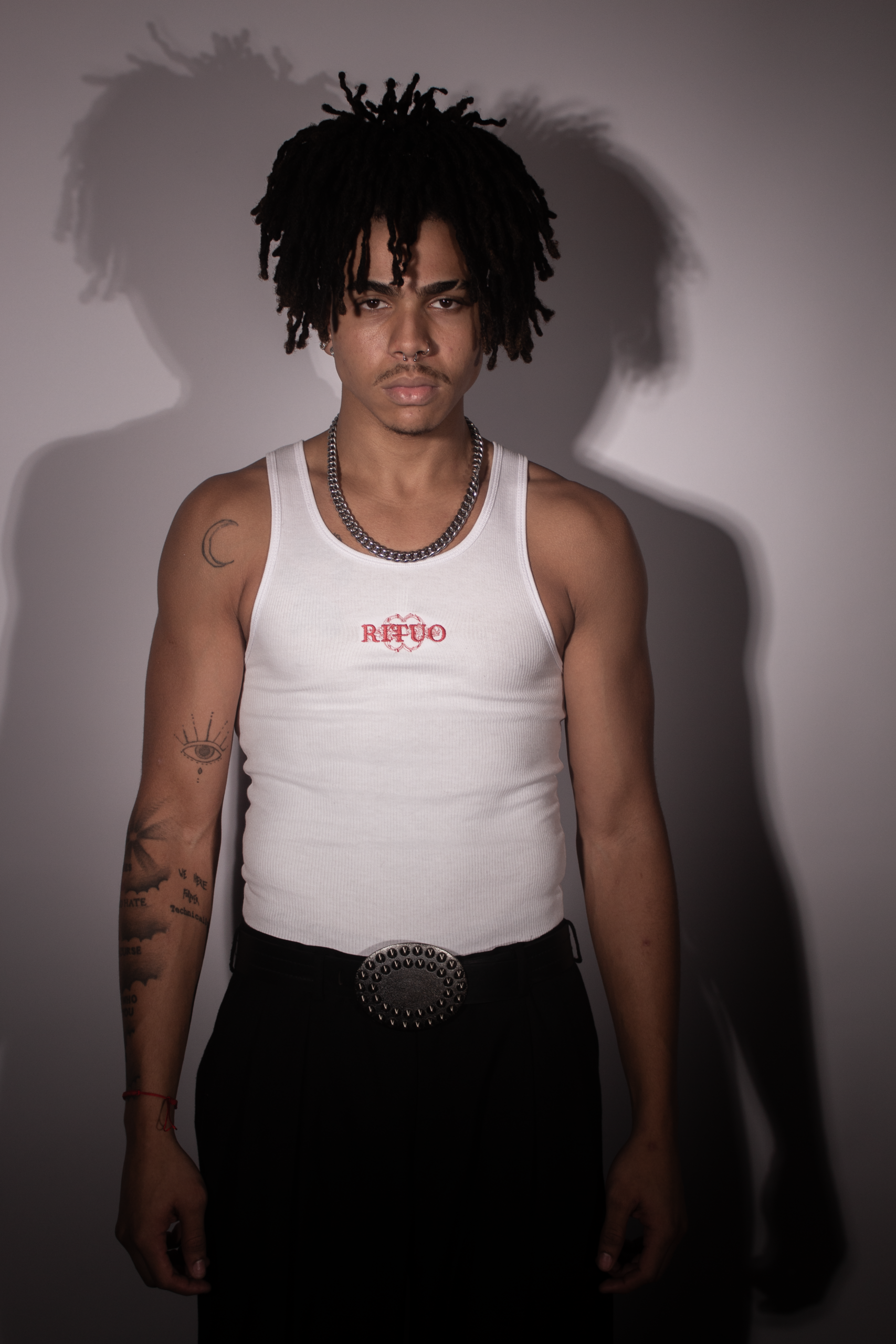 Camiseta de color blanco, estilo tank top. Prenda fabricada en algodón, de textura suave al tacto, con el logo de la marca RITUO en tamaño pequeño ubicado en la parte del pecho.