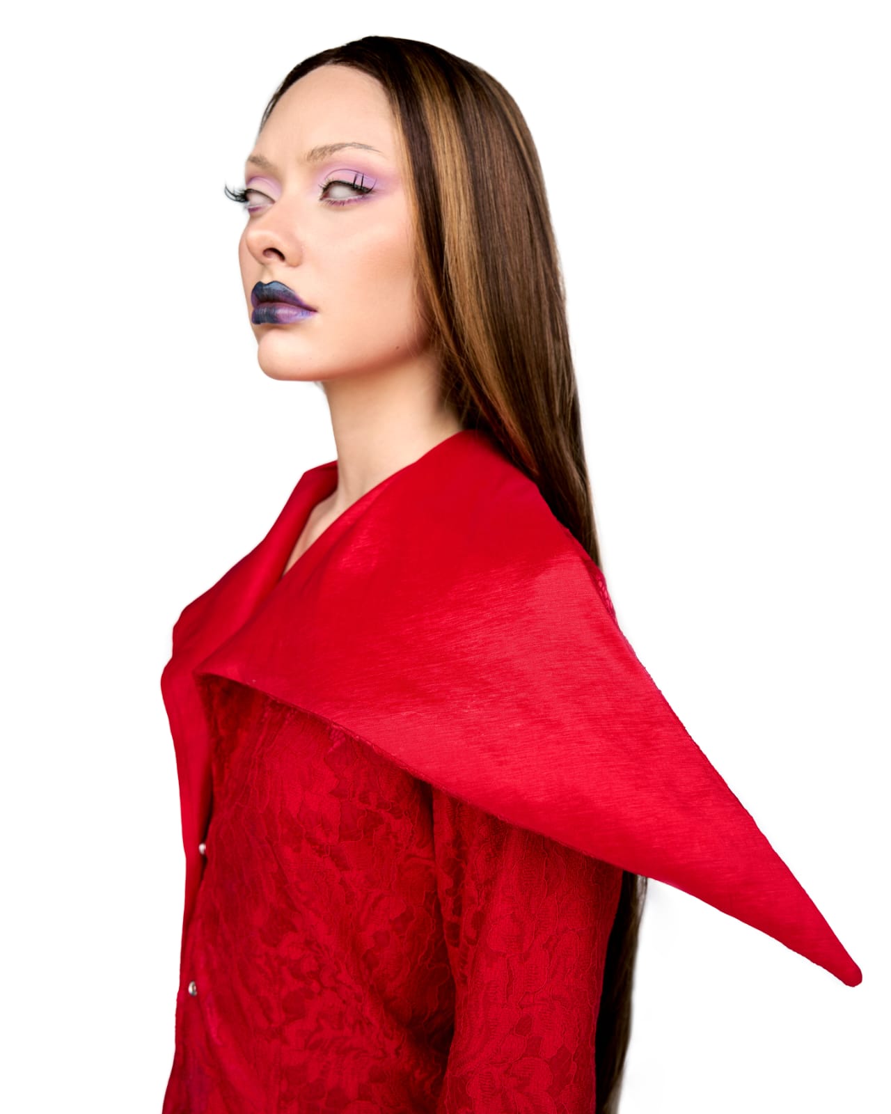 Blazer estructurado en encaje rojo, que destaca por su solapa puntiaguda de diseño definido y mangas acampanadas.